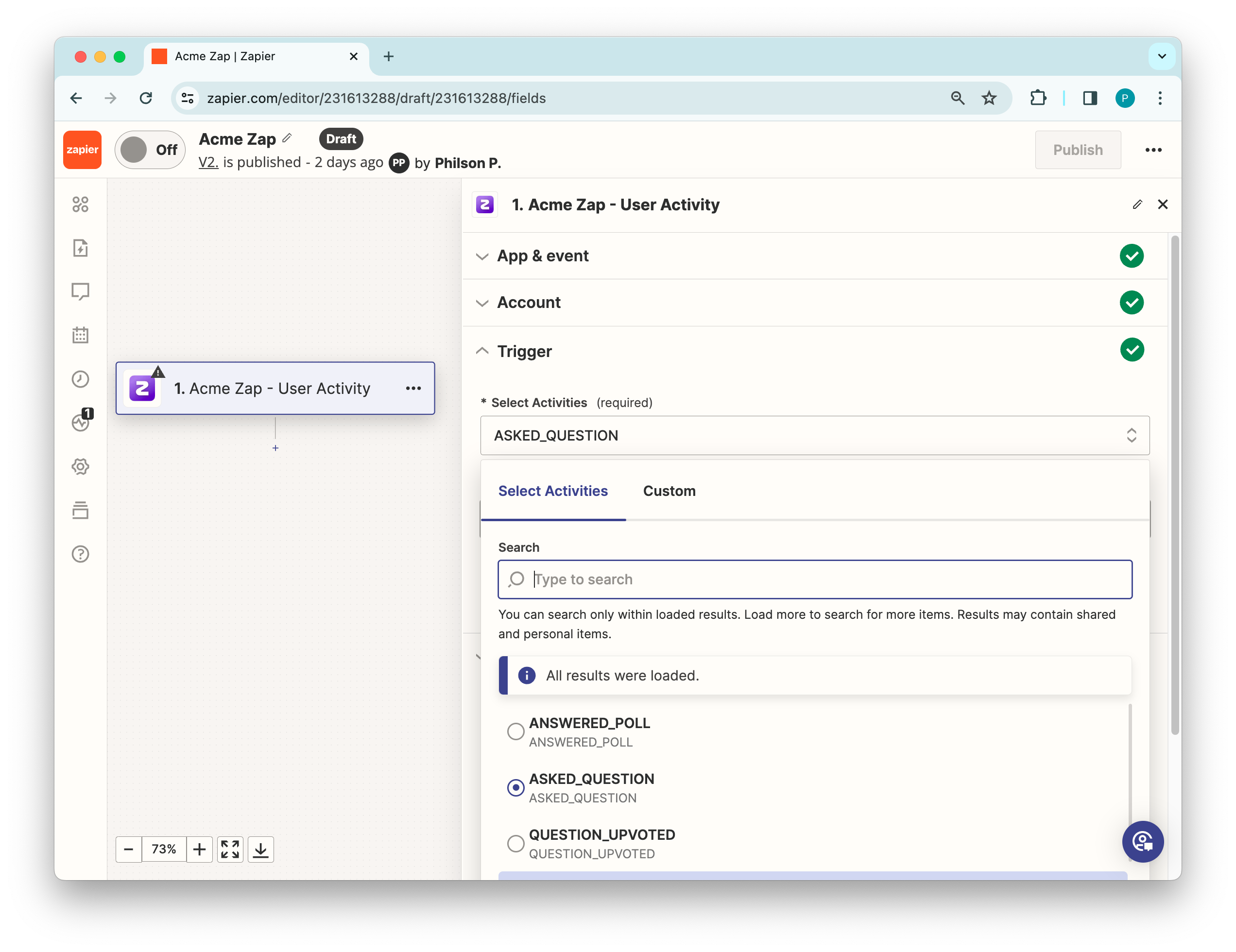 Under Trigger > Select Activities dropdown field, choose the activities from the Select Activities tab. Refer to the activity table for the description.