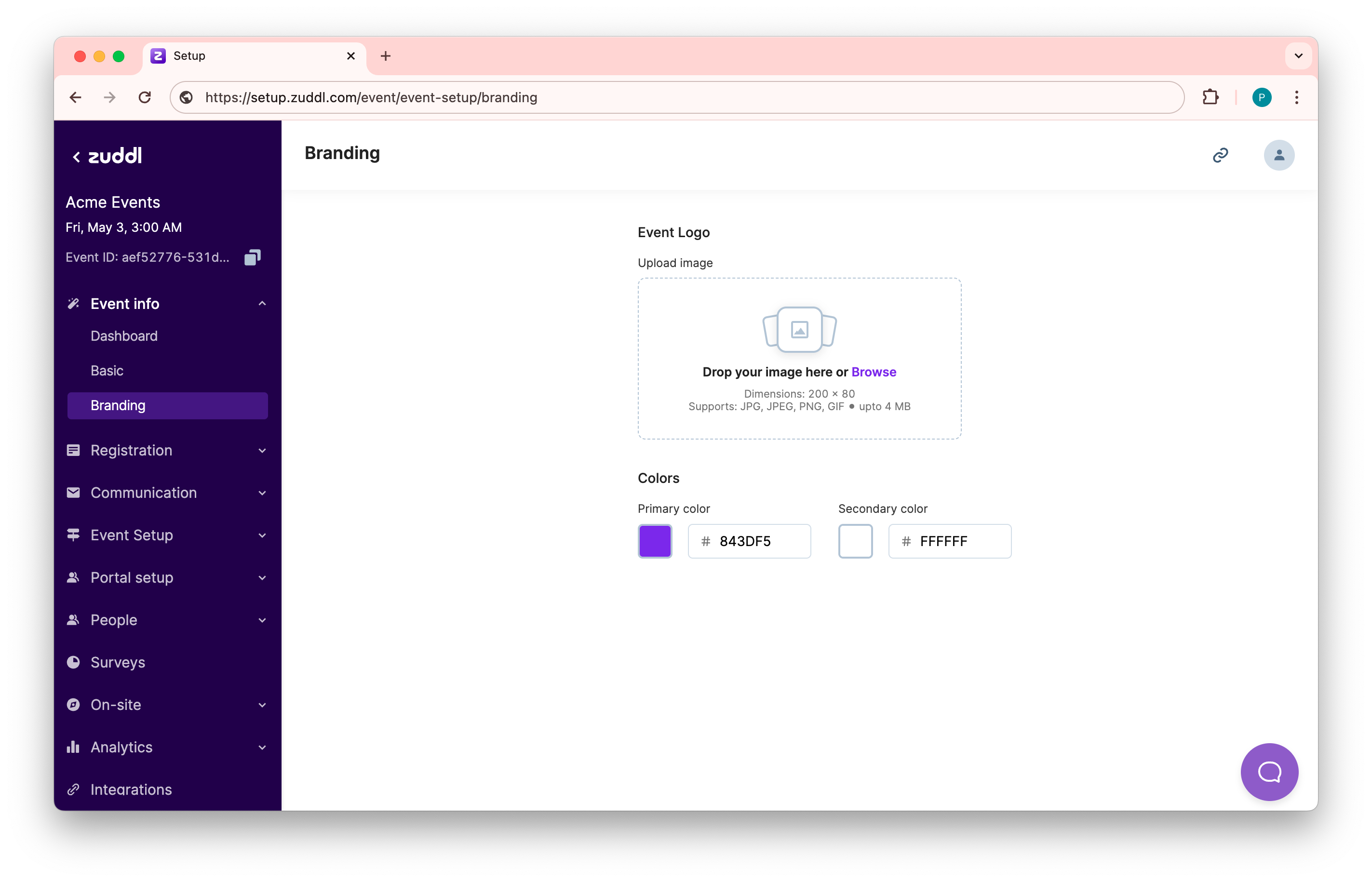 You can upload your event logo of dimensions 200 X 80 in JPG, PNG, and GIF format with a file size of up to 4MB.