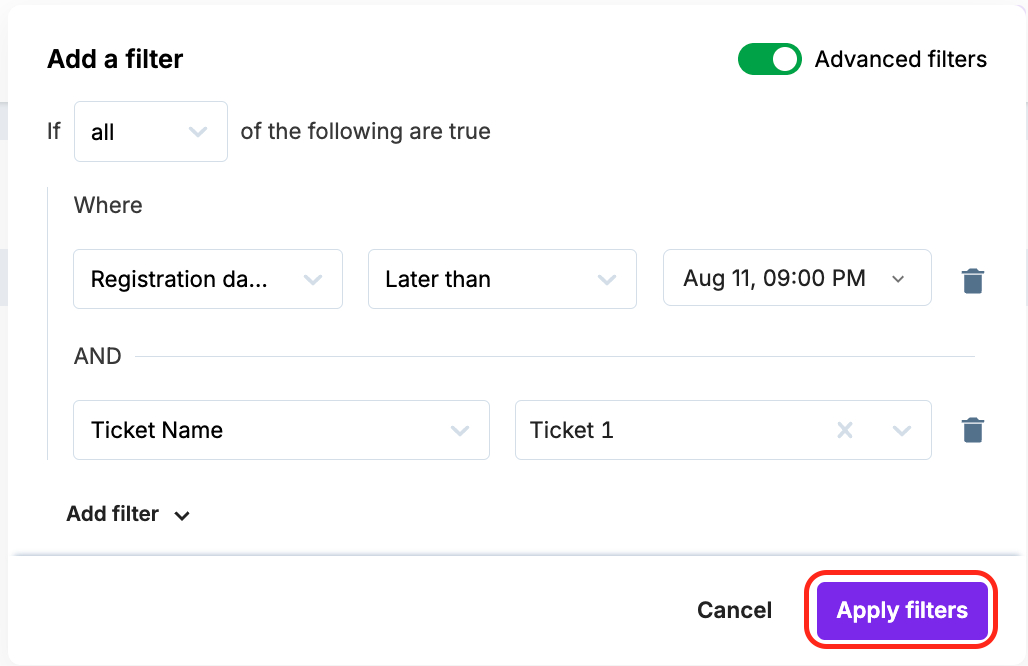 10. To apply a combination of filters with AND and OR operation, toggle on Advanced filters and select all or any for the governing statement.