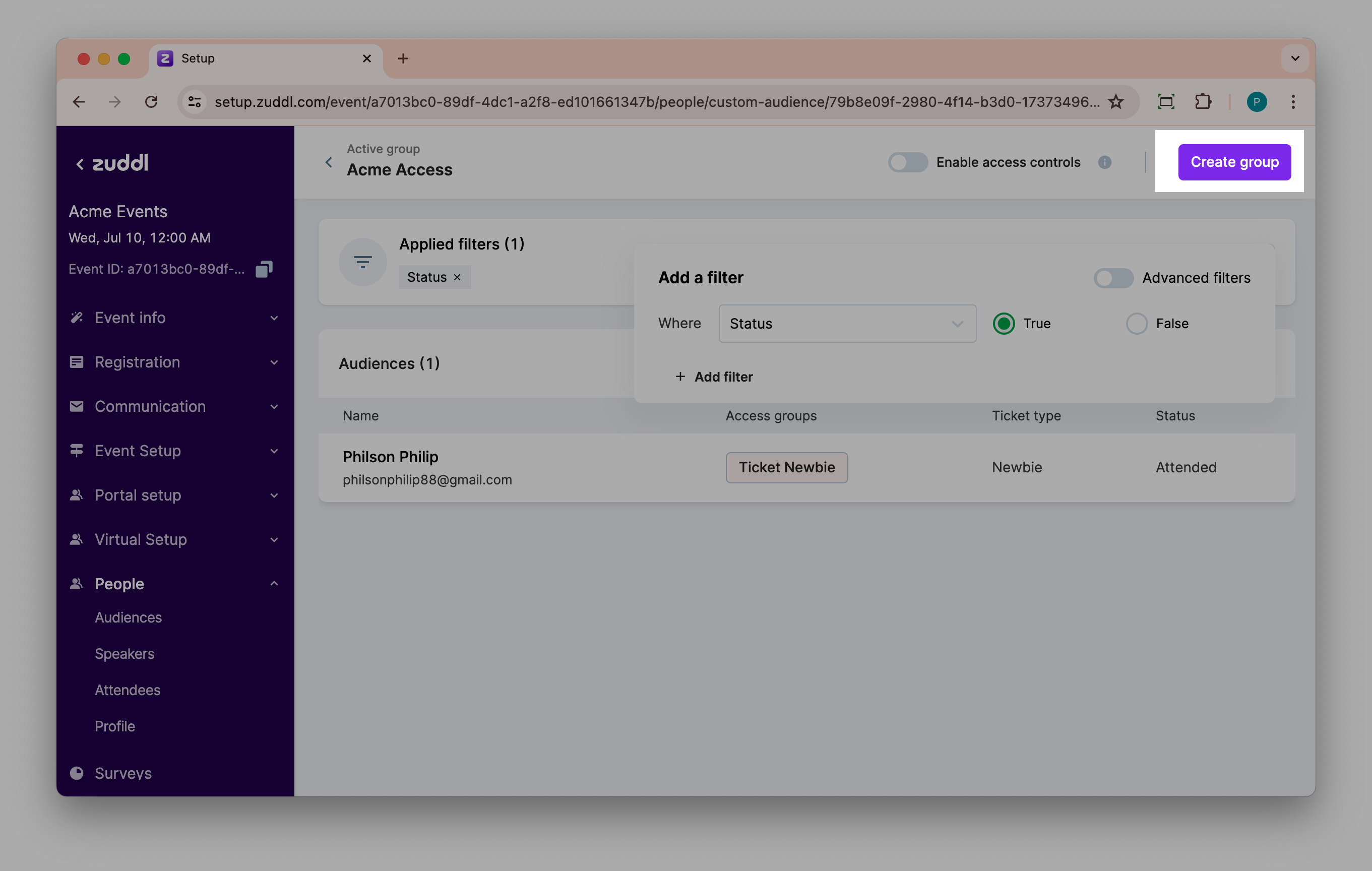 5. The attendees can be assigned to different groups, as shown in the All Audience section. To filter the attendees, click on the + Add filter button.