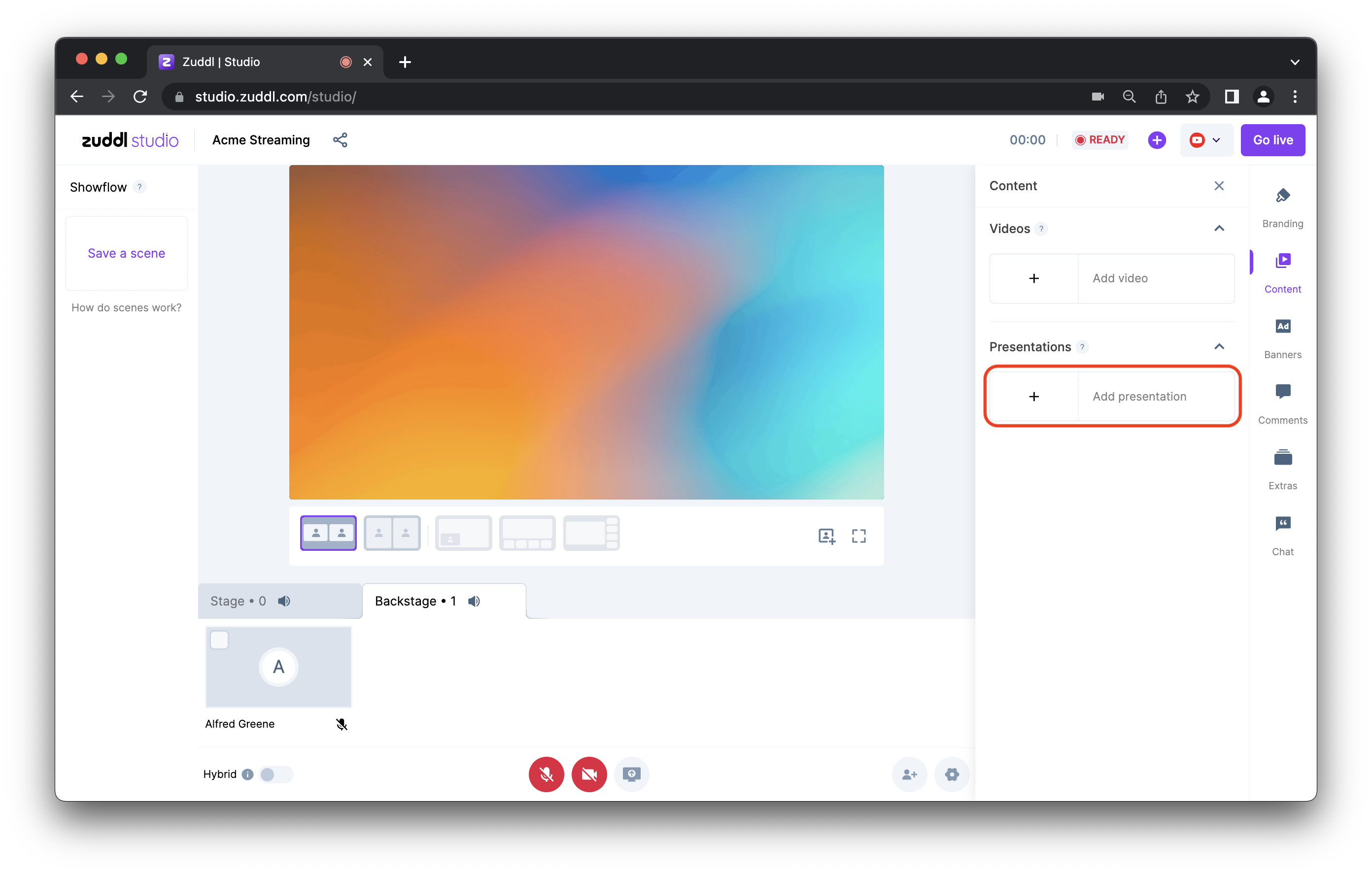 Like videos, you can also upload Presentations to your studio backstage and keep them ready to be shown during your live stream.