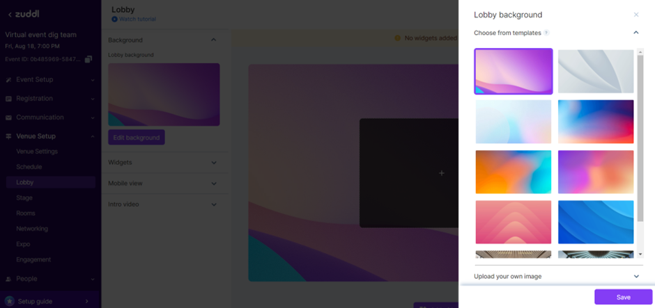 Choose one from the list of high-definition environments provided by Zuddl, or upload your background image from your device and click the Save button.