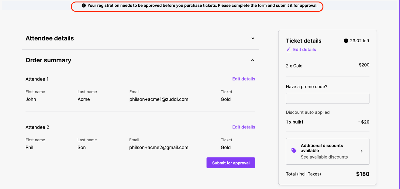 During the registration, after the purchaser has filled up the attendee details and clicked the Register Now button, on the order summary page, a banner is shown to registrant that informs them about approval.