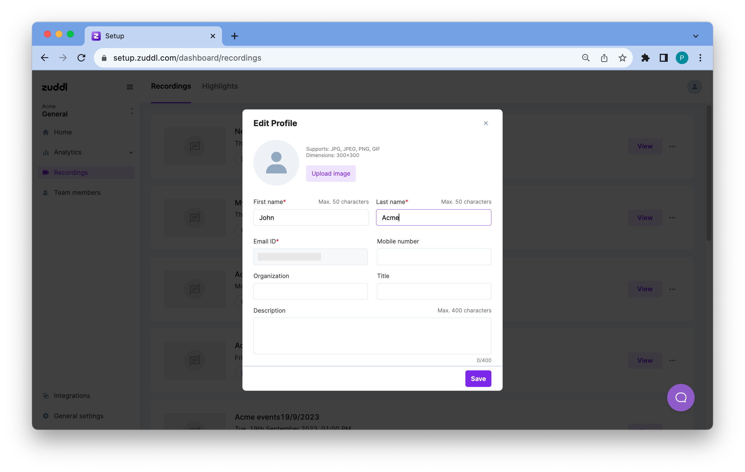 Here, you can edit your profile image and other information. Your email cannot be changed here since it is linked to your Zuddl account.