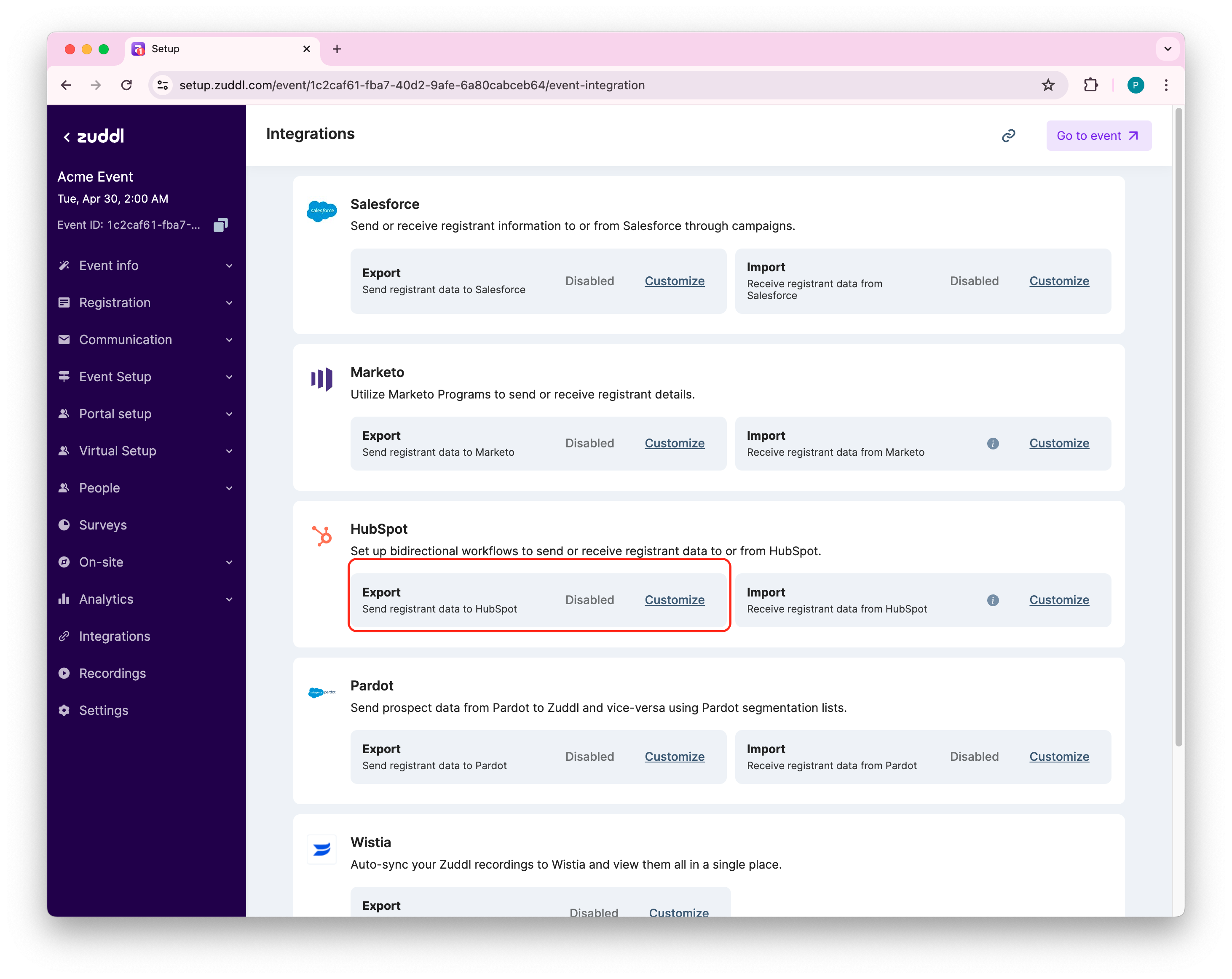 An event-level integration is required to pass all event-specific user data captured by Zuddl to HubSpot.