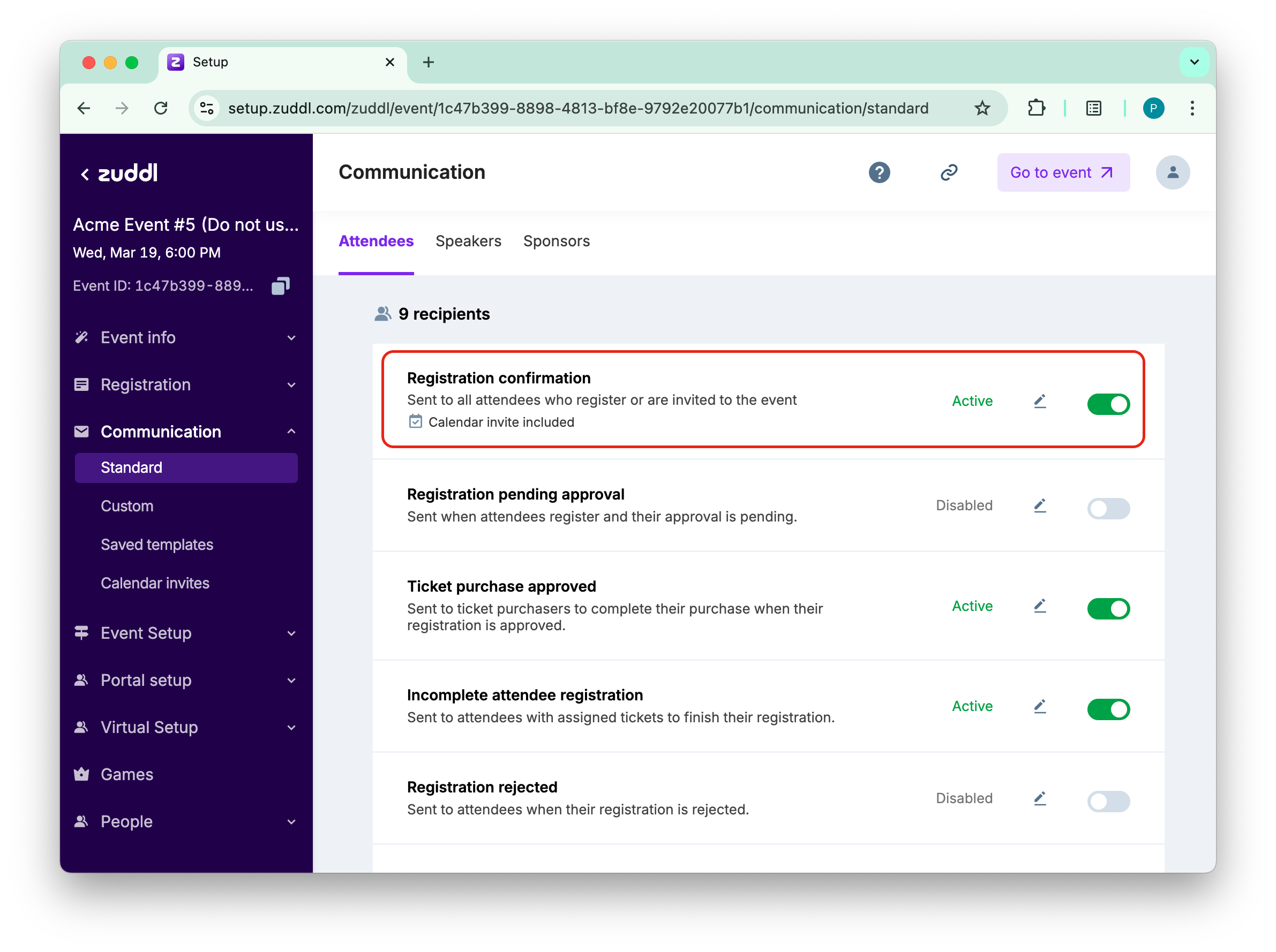 Ensure you toggle on the “Registration confirmation” email from the Communication menu for attendees. Without this enablement, registrants will not receive any event invitation.