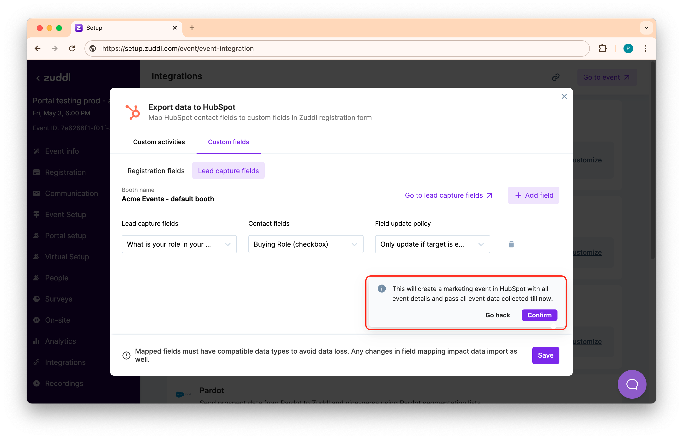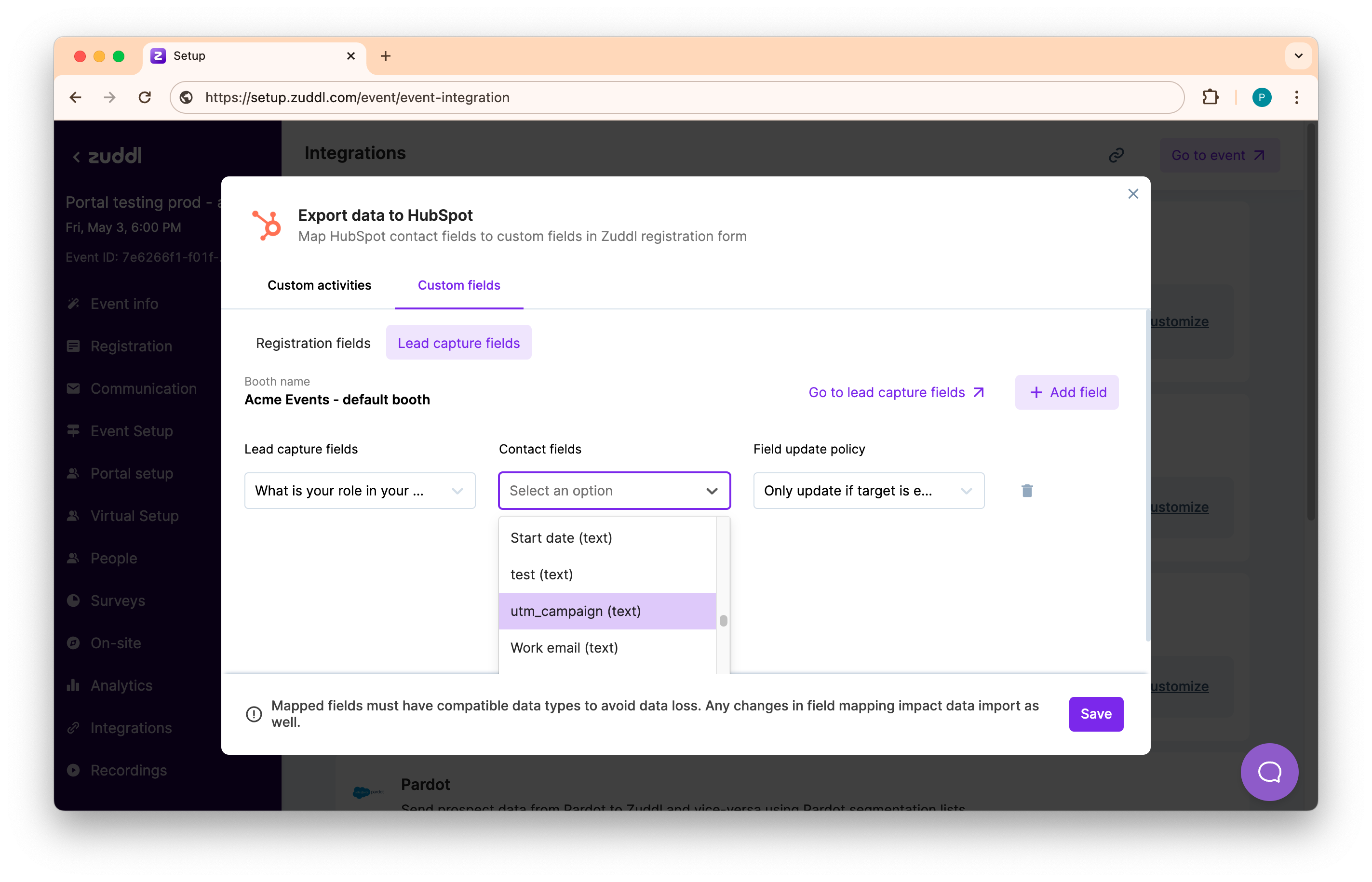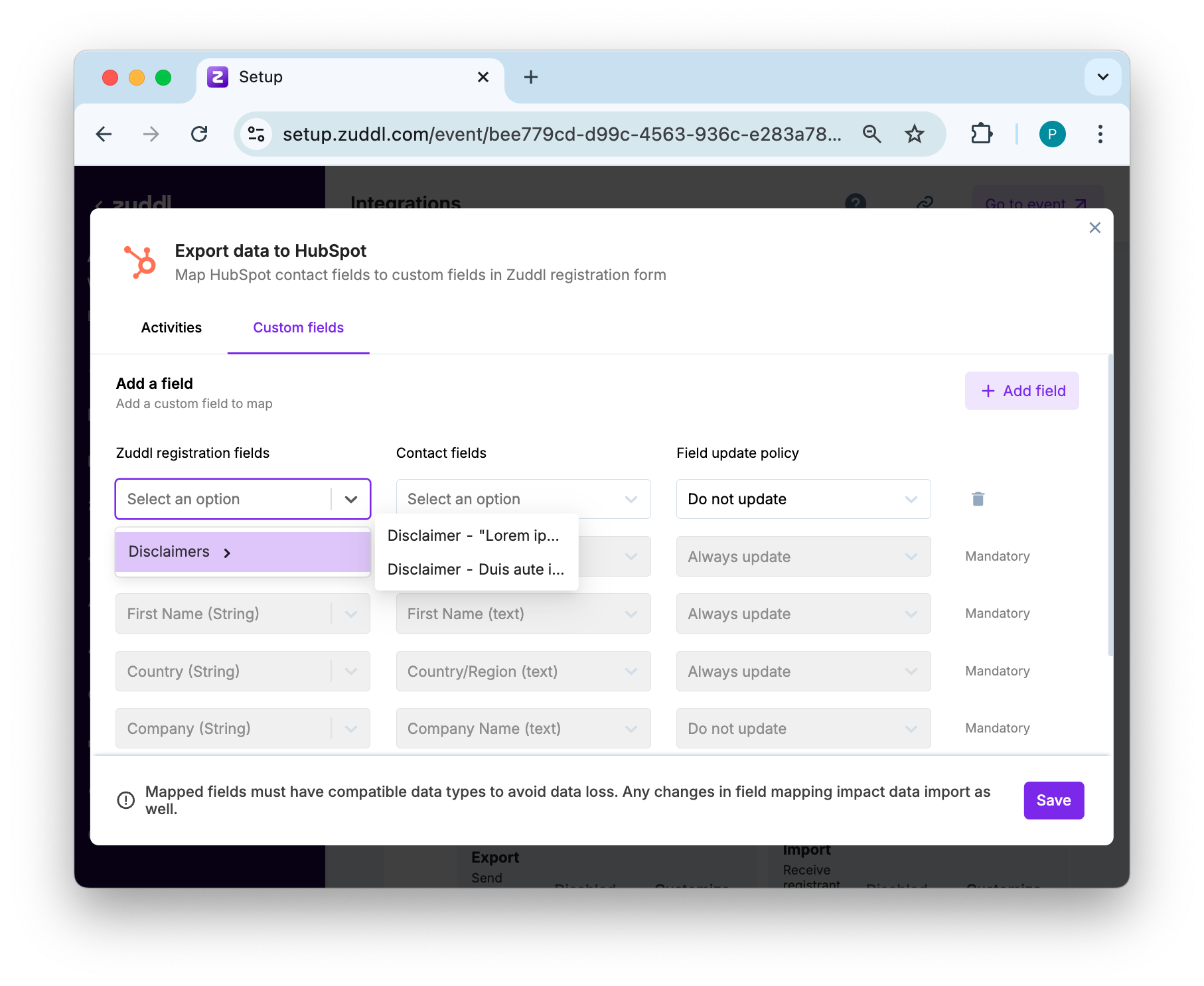 Ensure that both Zuddl and HubSpot object fields have compatible data types. You will lose the registration and activity data if you map fields with incorrect data types.