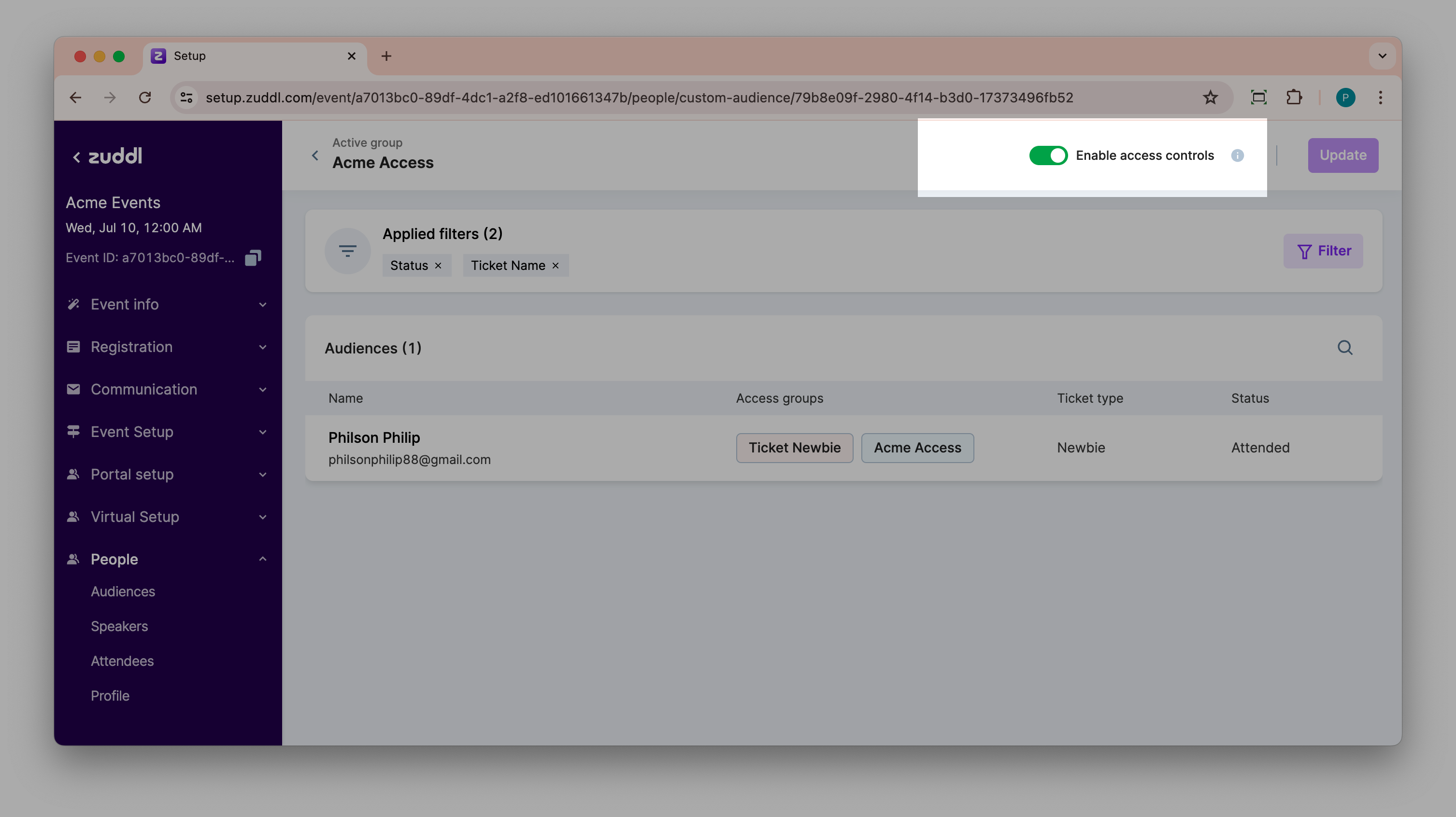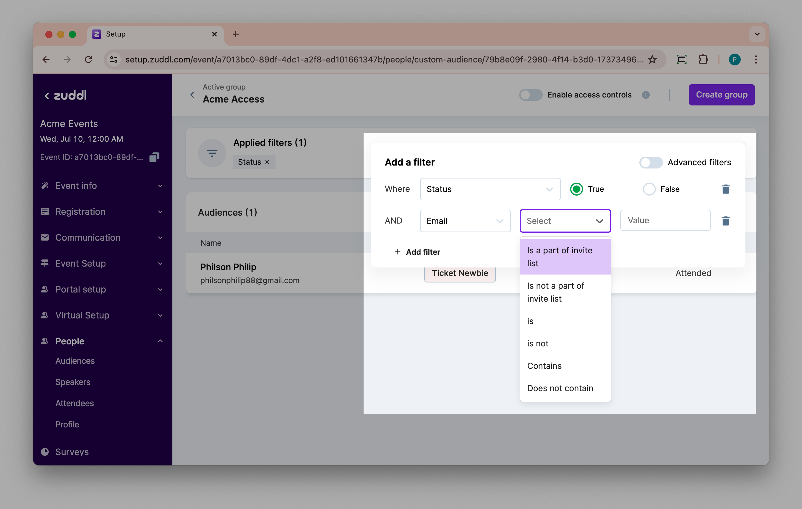 The attendees can be assigned to different groups, as shown in the All Audience section. To filter the attendees, click on the + Add filter button.