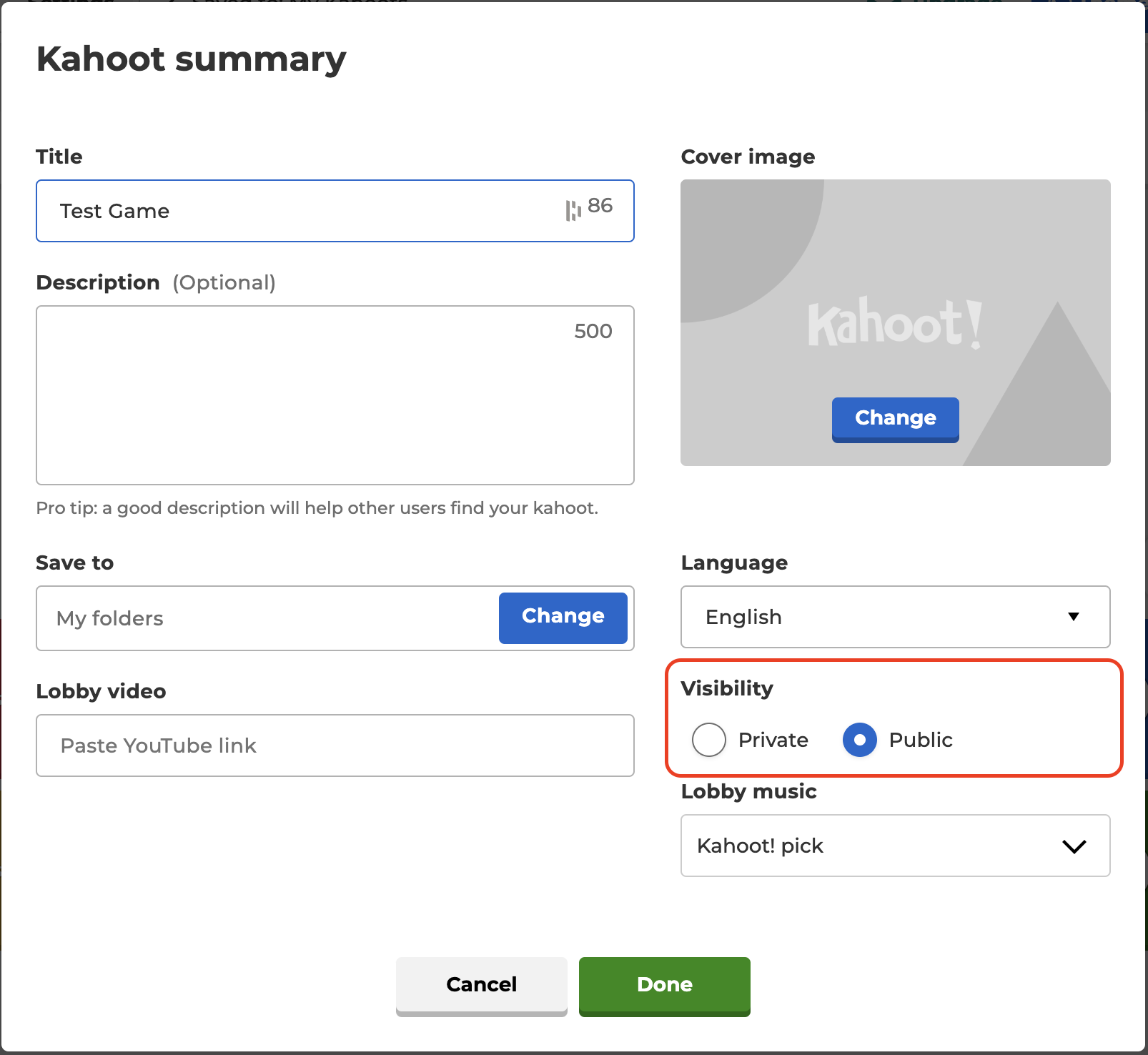 Kahoot Settings.png - Click Save. This shows how you can use the new Kahoot.