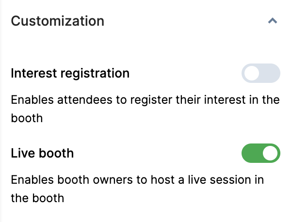 - Live booth adds a live stream feed to the booth, where the booth owner can interact with visitors.