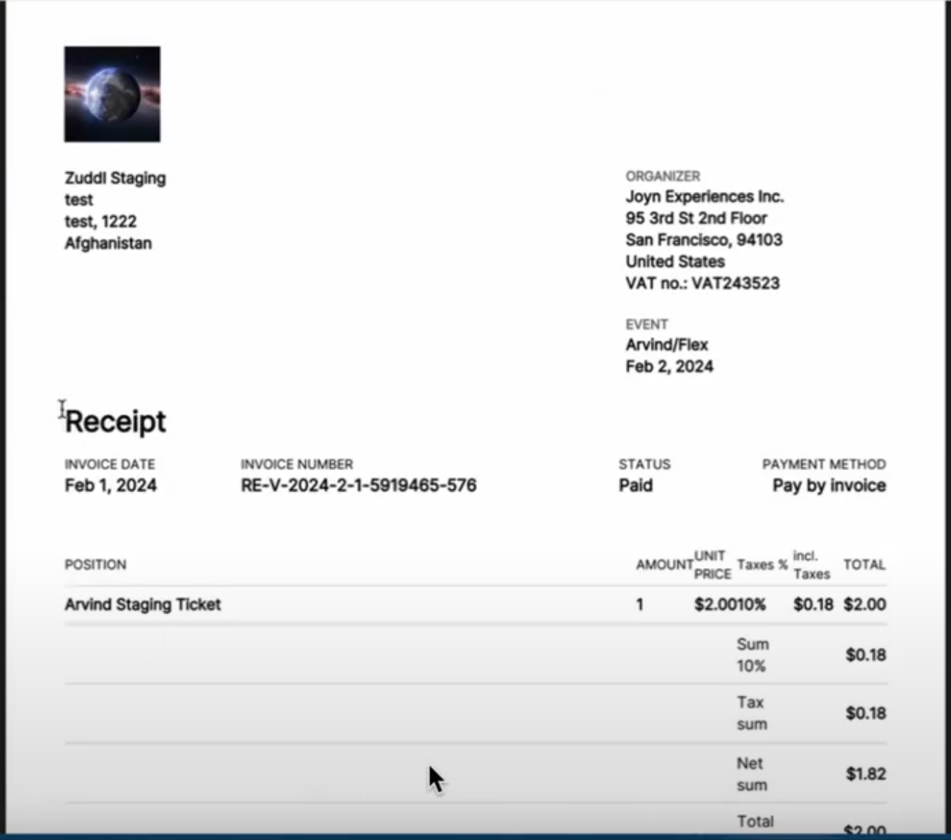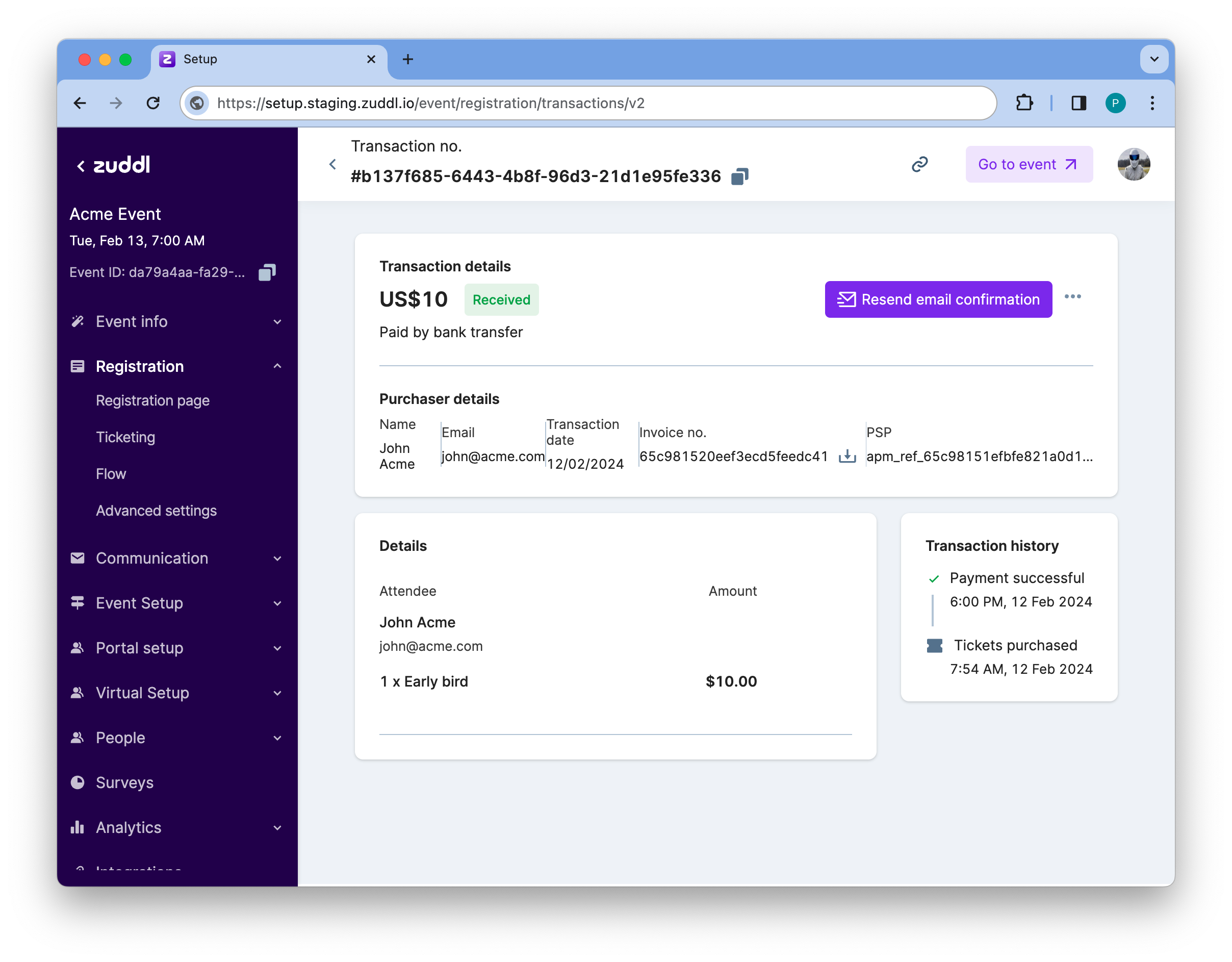 A Ticket purchase confirmation email with an attached invoice PDF is also sent to the attendee email address. On the order success page, you can click the Resend invoice button to resend the invoice to the attendee.