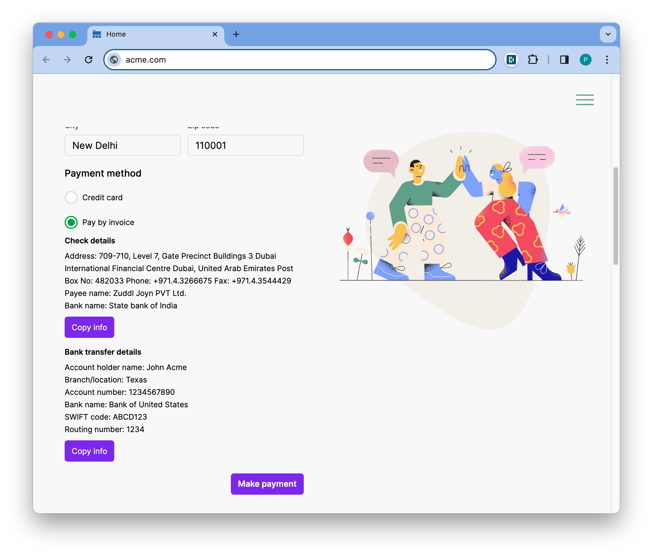 Click on the Pay by Invoice button and view the payment method details. In this example, the bank and check details are shown as per the settings configured.