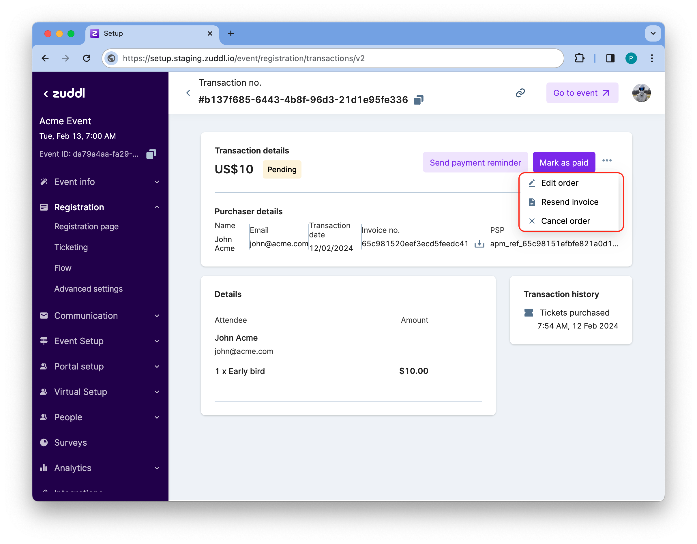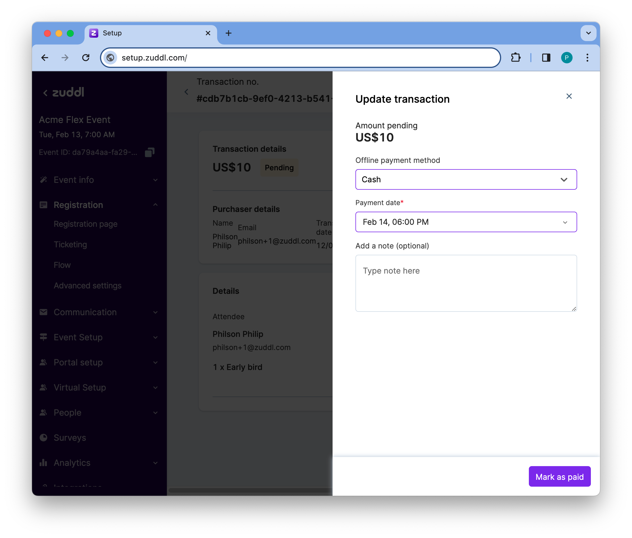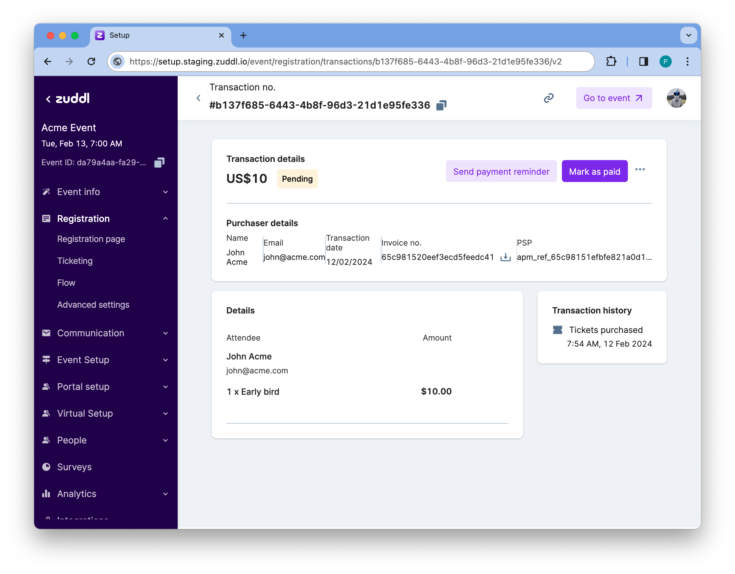 If no payment was made for a transaction, you can click on a transaction and click Send payment reminder button to remind the attendee to make the payment.