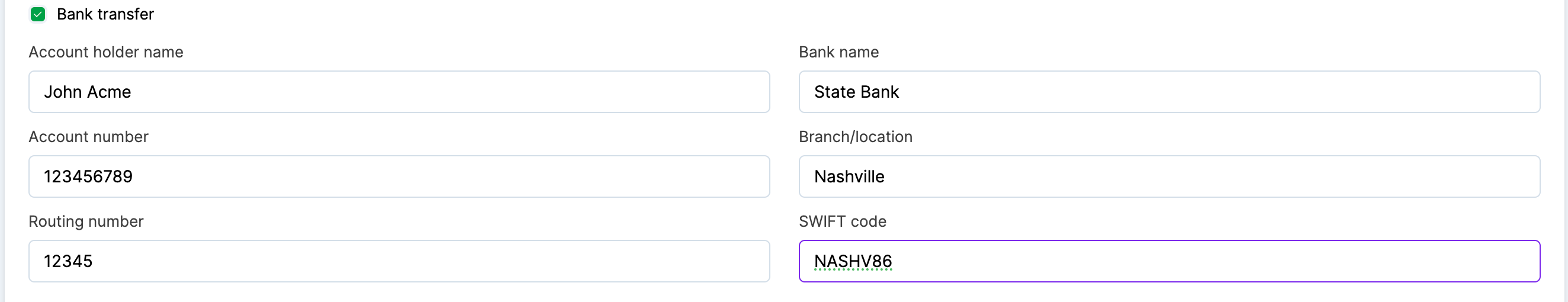 Bank transfer: select this option to allow bank transfers. To show the recipient's bank details, enter the following details: