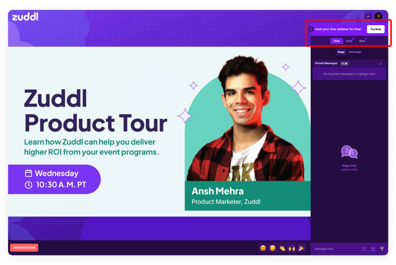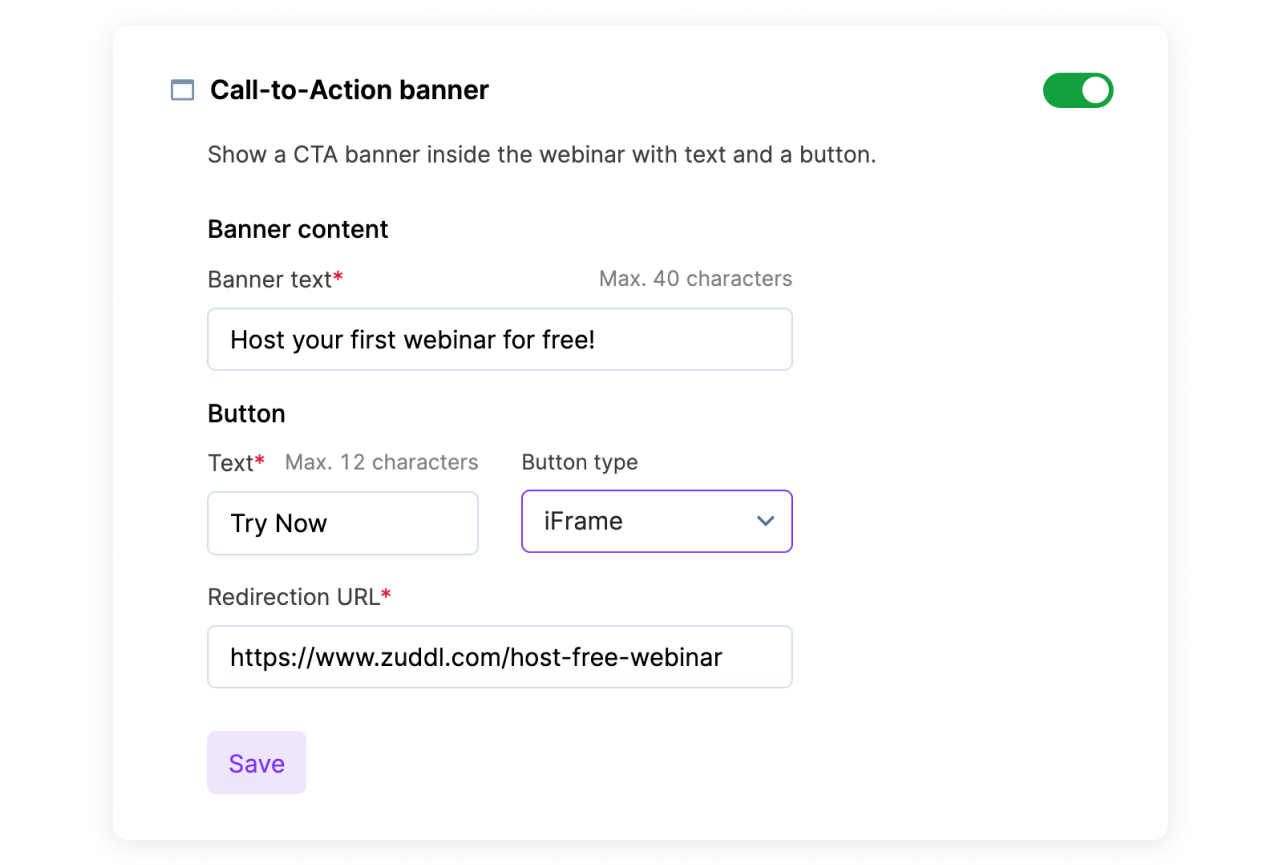 A Call-to-action (CTA) banner is an interactive component that can be added to a webinar to direct your attendees to an external URL.