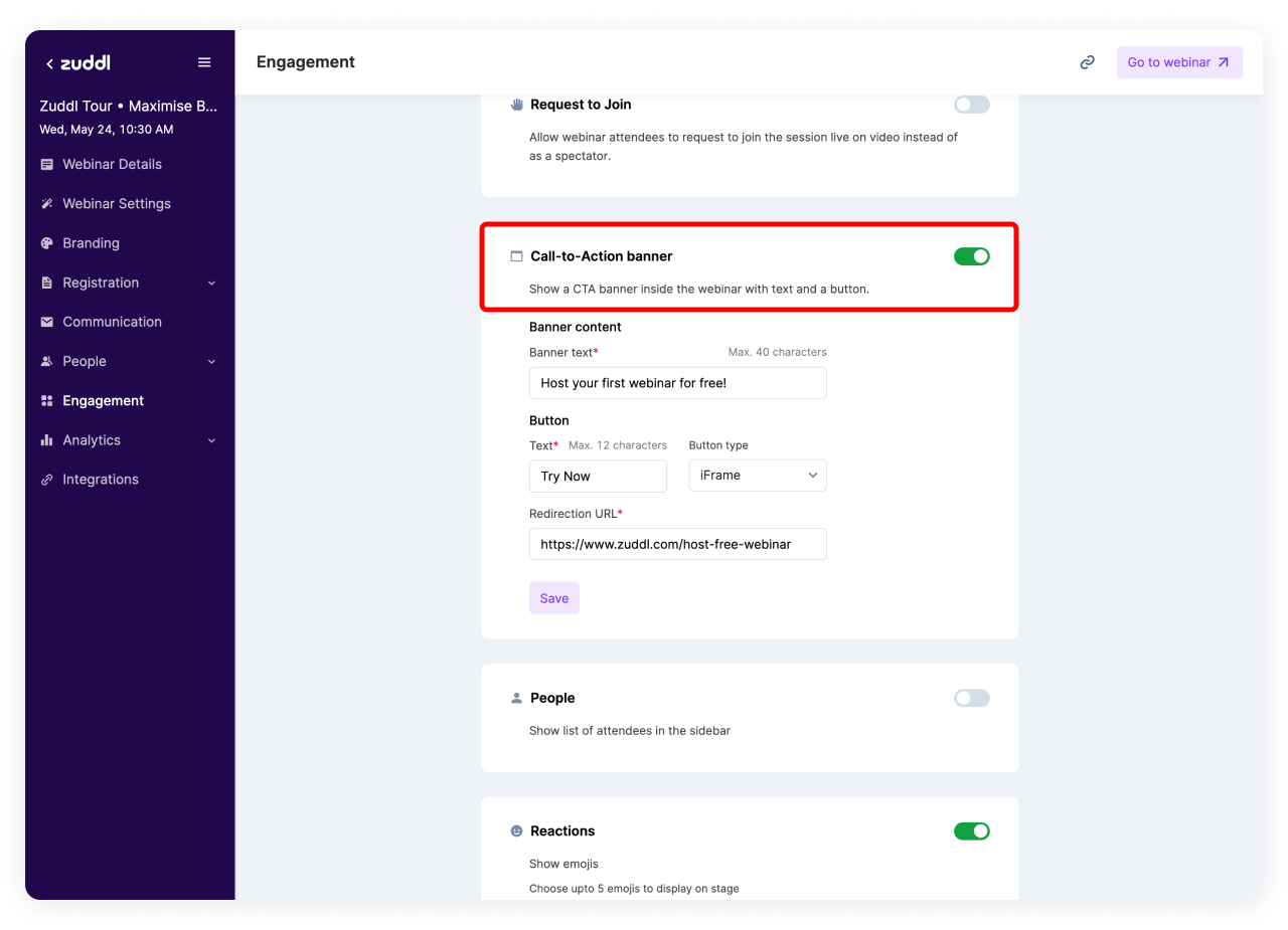 To customize your CTA banner, go to the Engagement page of the webinar setup and toggle on the Call-to-Action banner.
