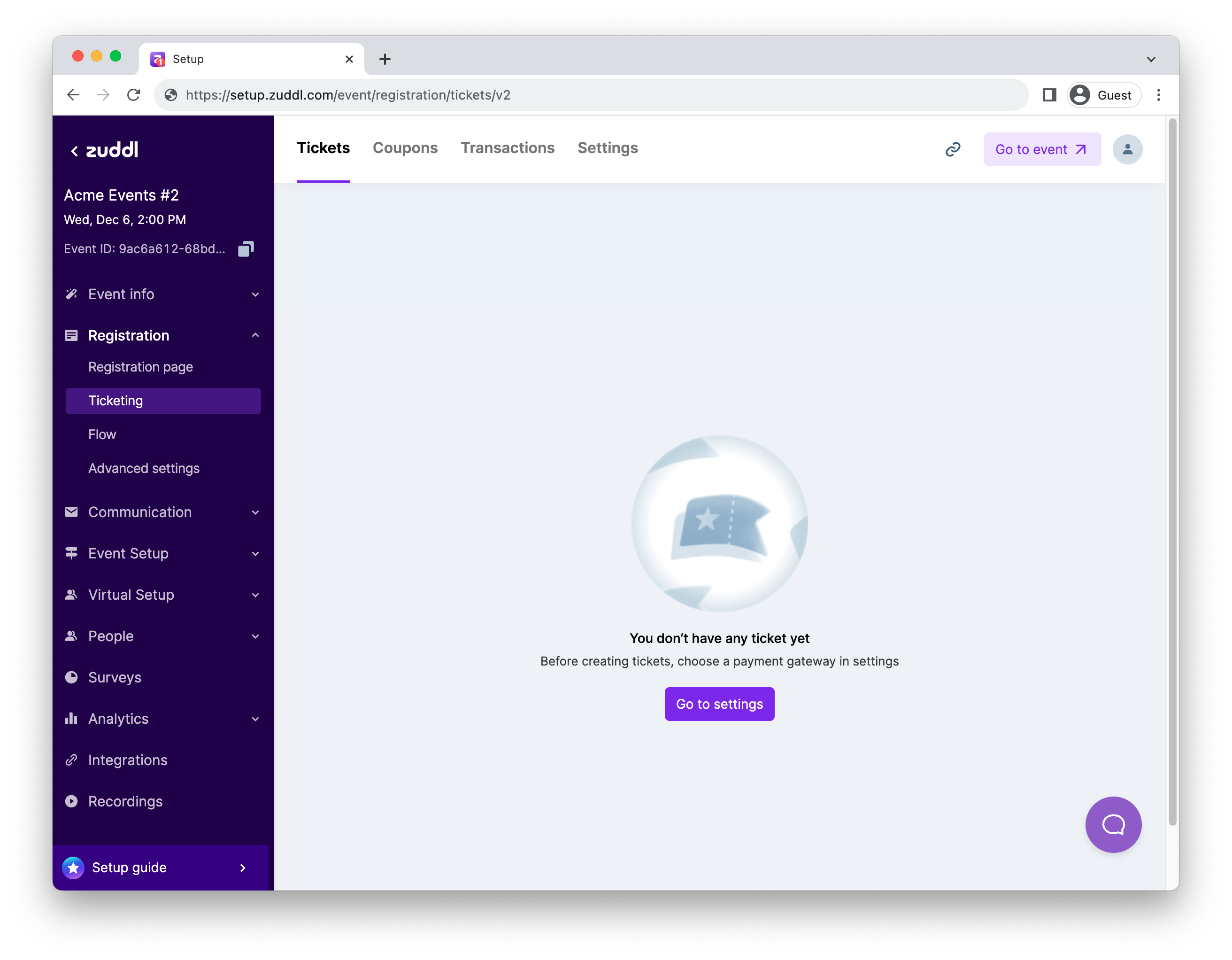 If you haven’t added the tickets yet, click on the Add tickets button to initiate the ticket creation process.