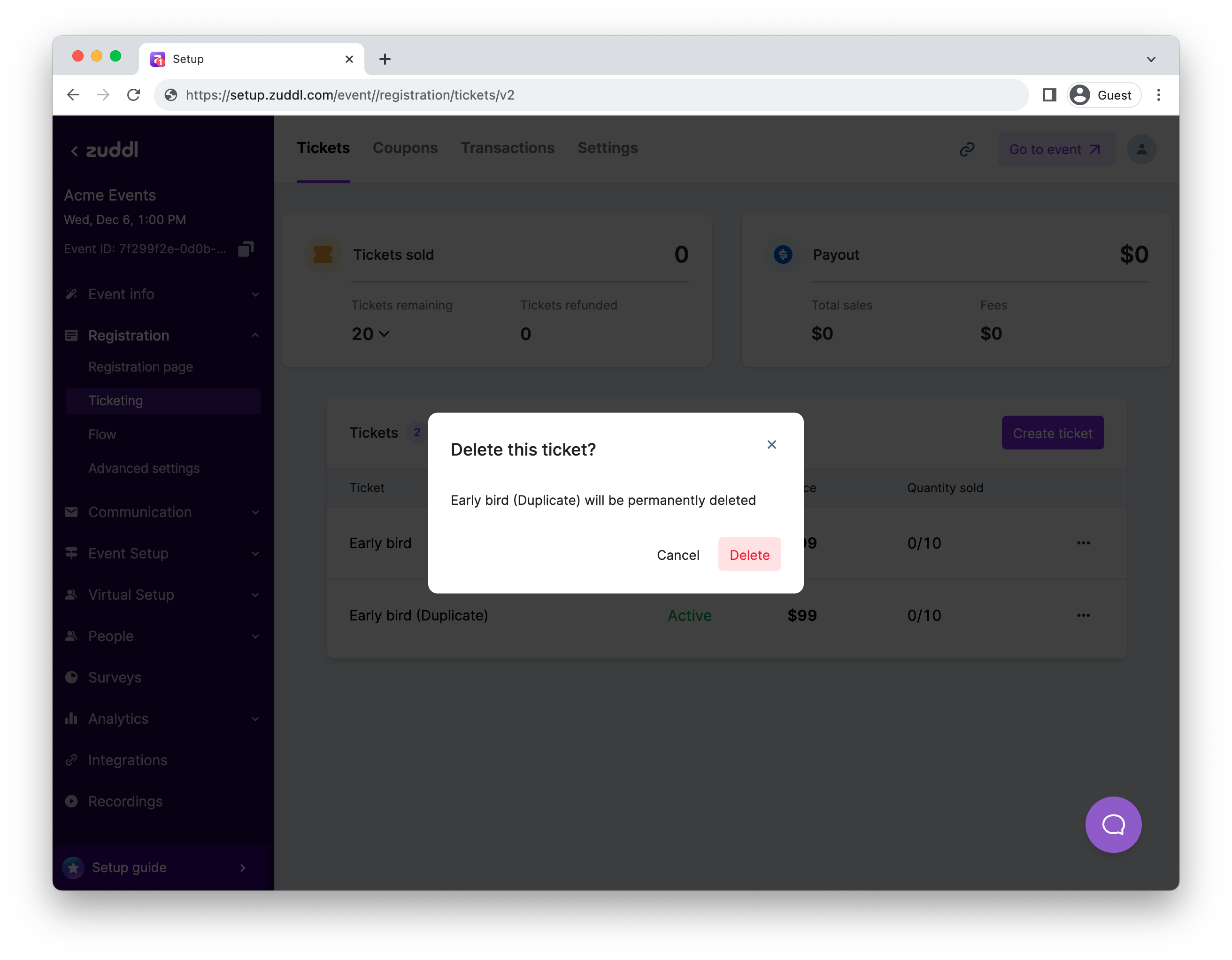 Zuddl enables you to create tickets for your event using the ticketing tool. You can either create tickets before you start editing the registration flow or initiate the ticketing flow from the flow builder.