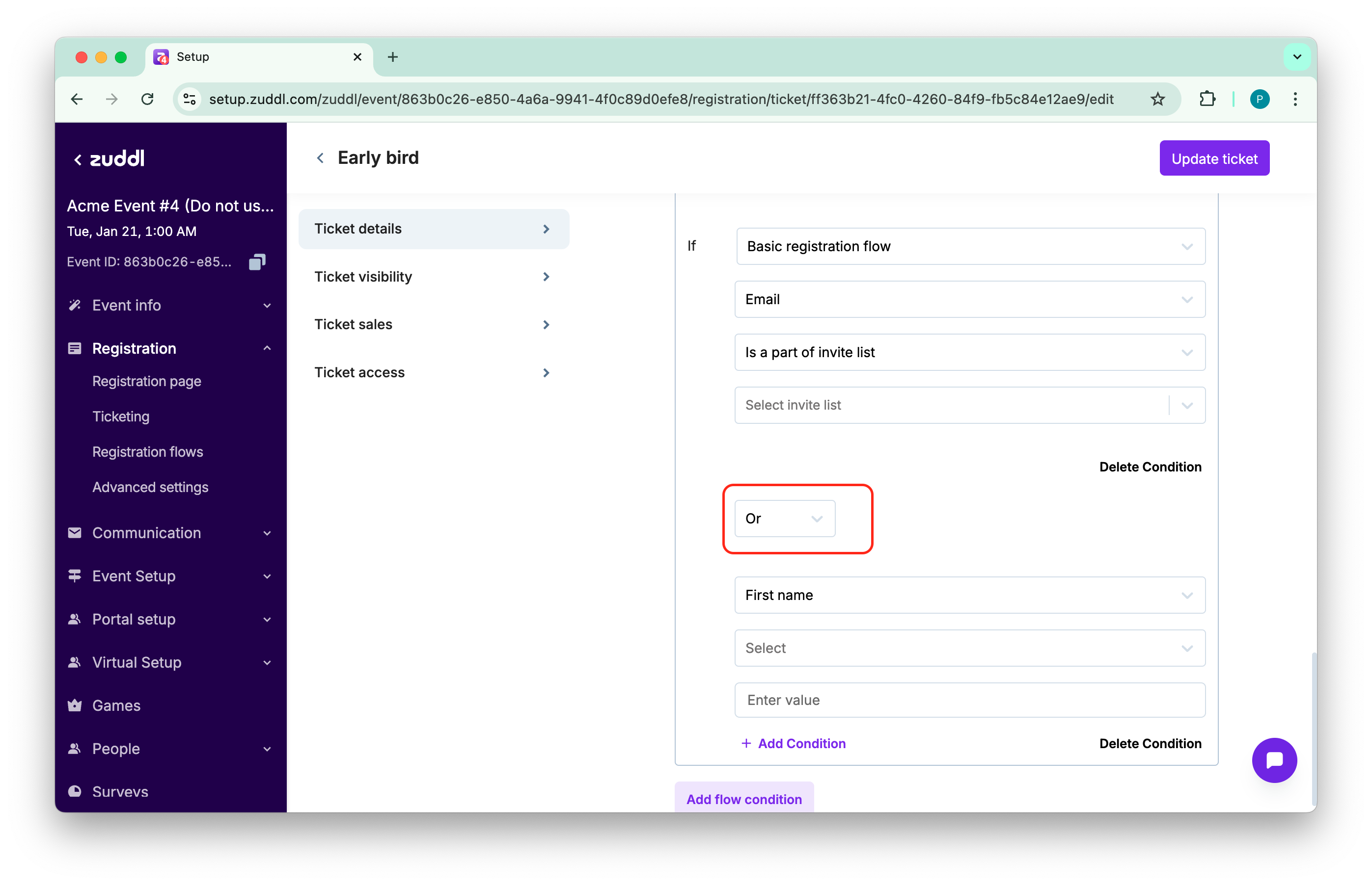 You can further apply conditions to make tickets available based on inputs in the registration flow. Follow these steps to add these conditions: