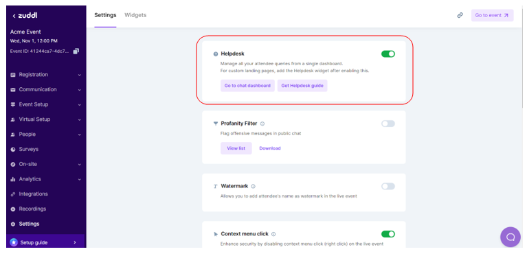 In Zuddl, we’ve named this feature as Helpdesk. To enable the Helpdesk for your event: