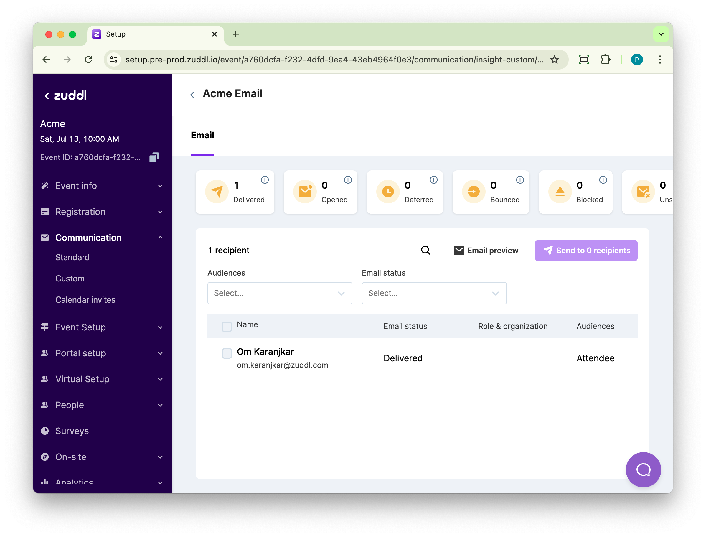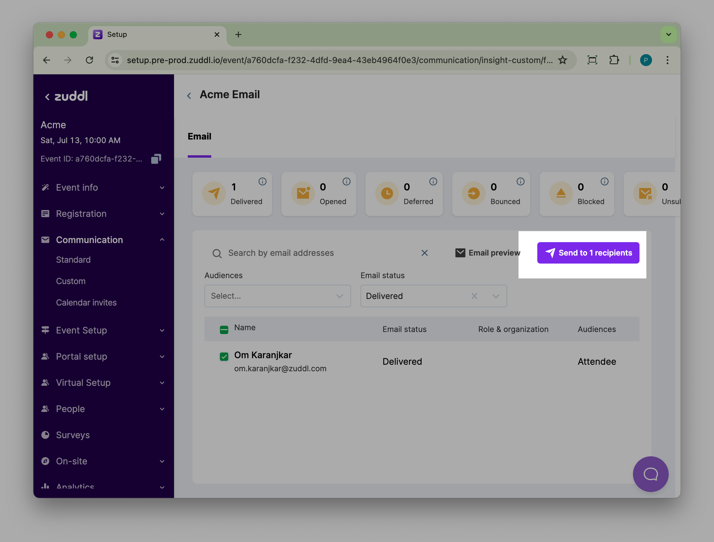 Search for the relevant recipients from the list using filters such as Audiences and Email status. All the email statuses are listed in the dropdown.