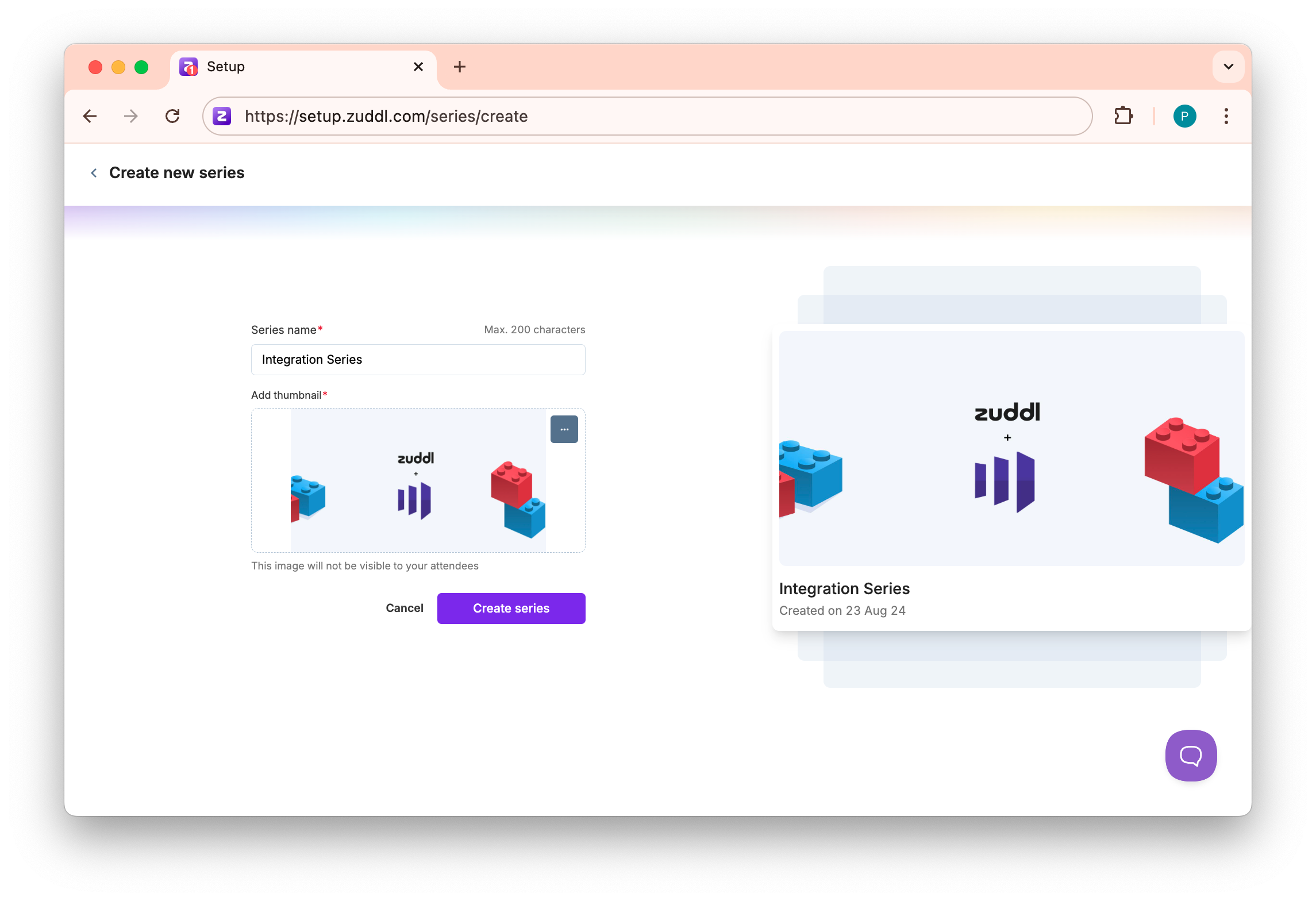 Enter a Series name and upload a thumbnail image. This image is only visible on the dashboard and not shown to attendees.