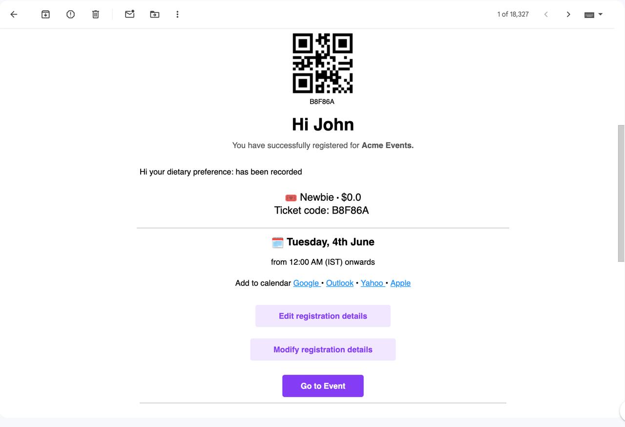 PDF link | Adds a downloadable PDF link in the email body for Registration confirmation, Event Invite, Attendee registration trigger email, and Ticket confirmation. This link shows three types of PDF links: registration confirmation, Invoice, and Receipt |