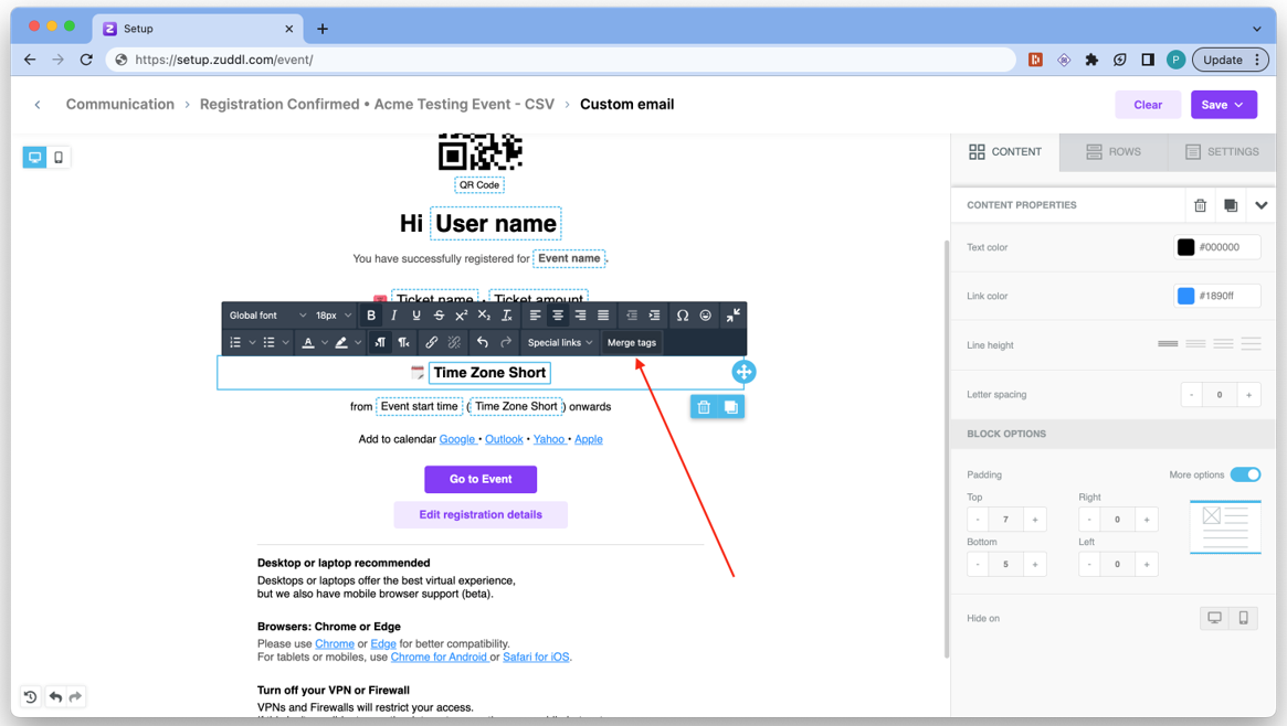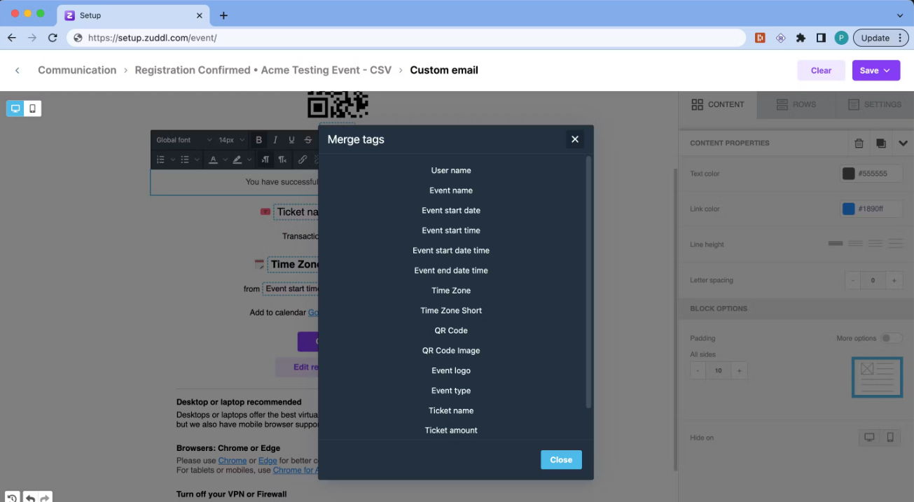 Merge tags are dynamic variables that you can easily insert in your emails for which Zuddl fetches the value from the backend. For example, you can add the ‘User name’ merge tag to your email template, and Zuddl will automatically bring the names of all the attendees to whom this email is sent. So each attendee would receive personalized emails.