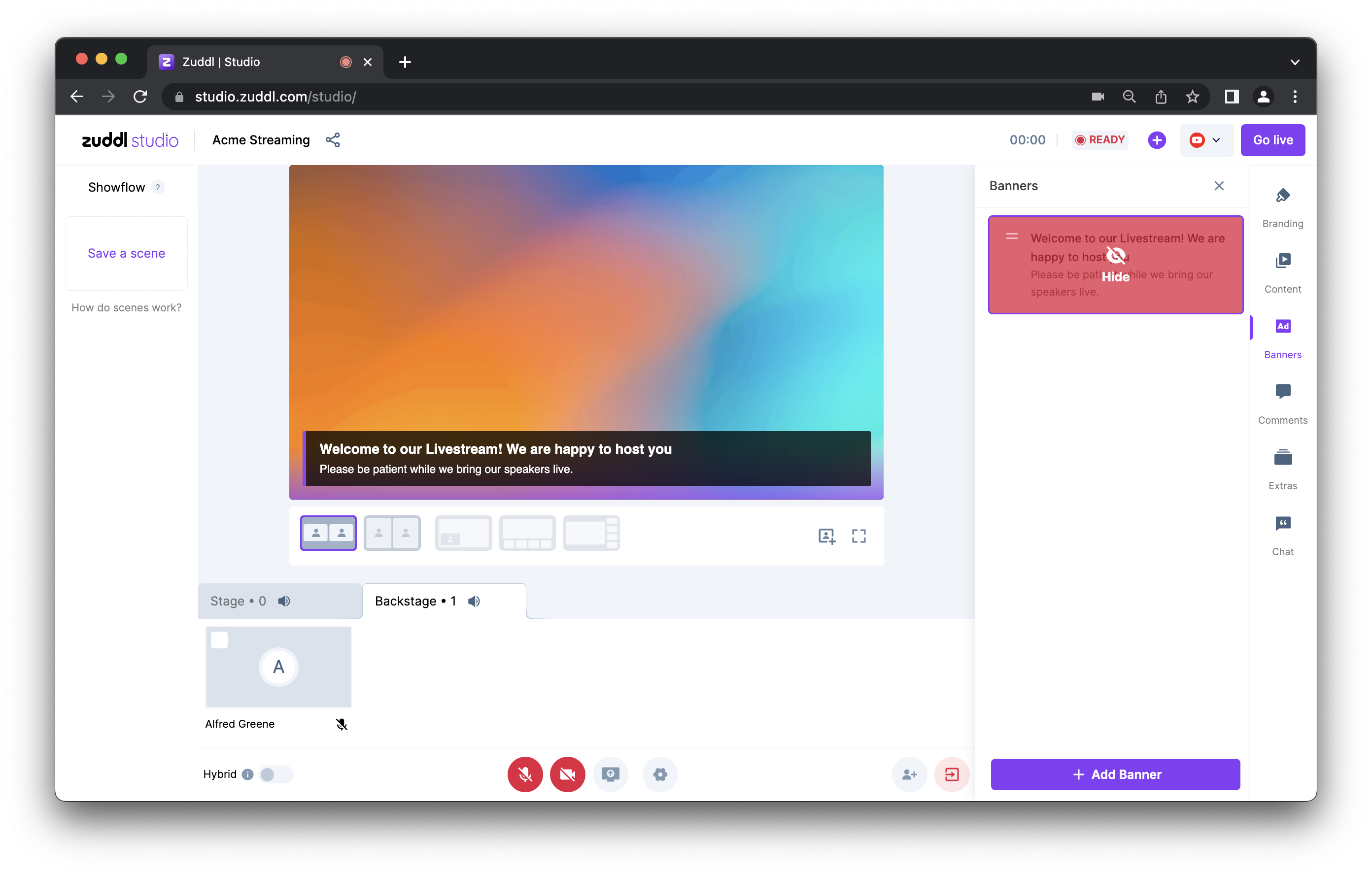 Click Show to add the banner to the stage - To stop showing the banner, click the red Hide button on the same banner card.