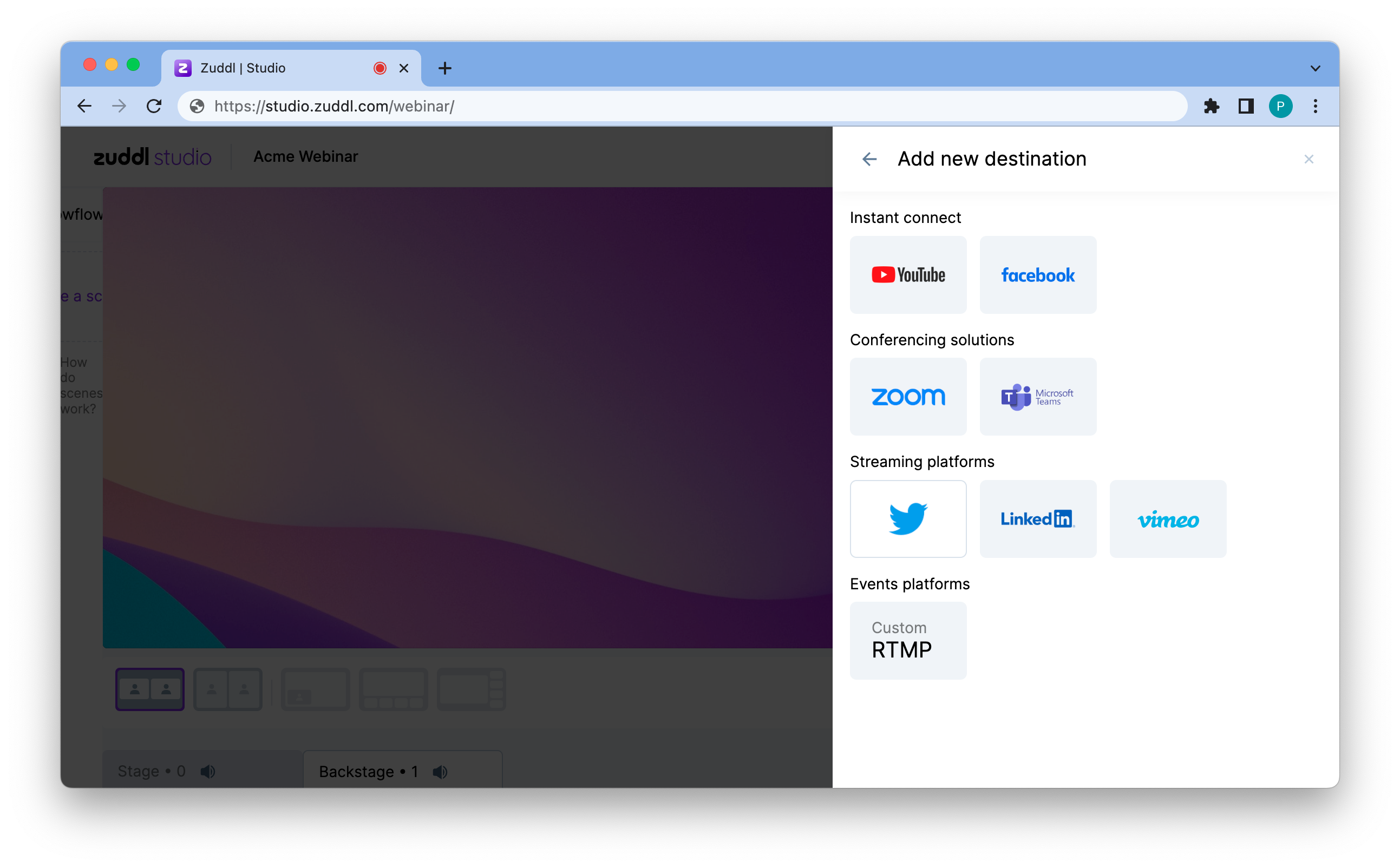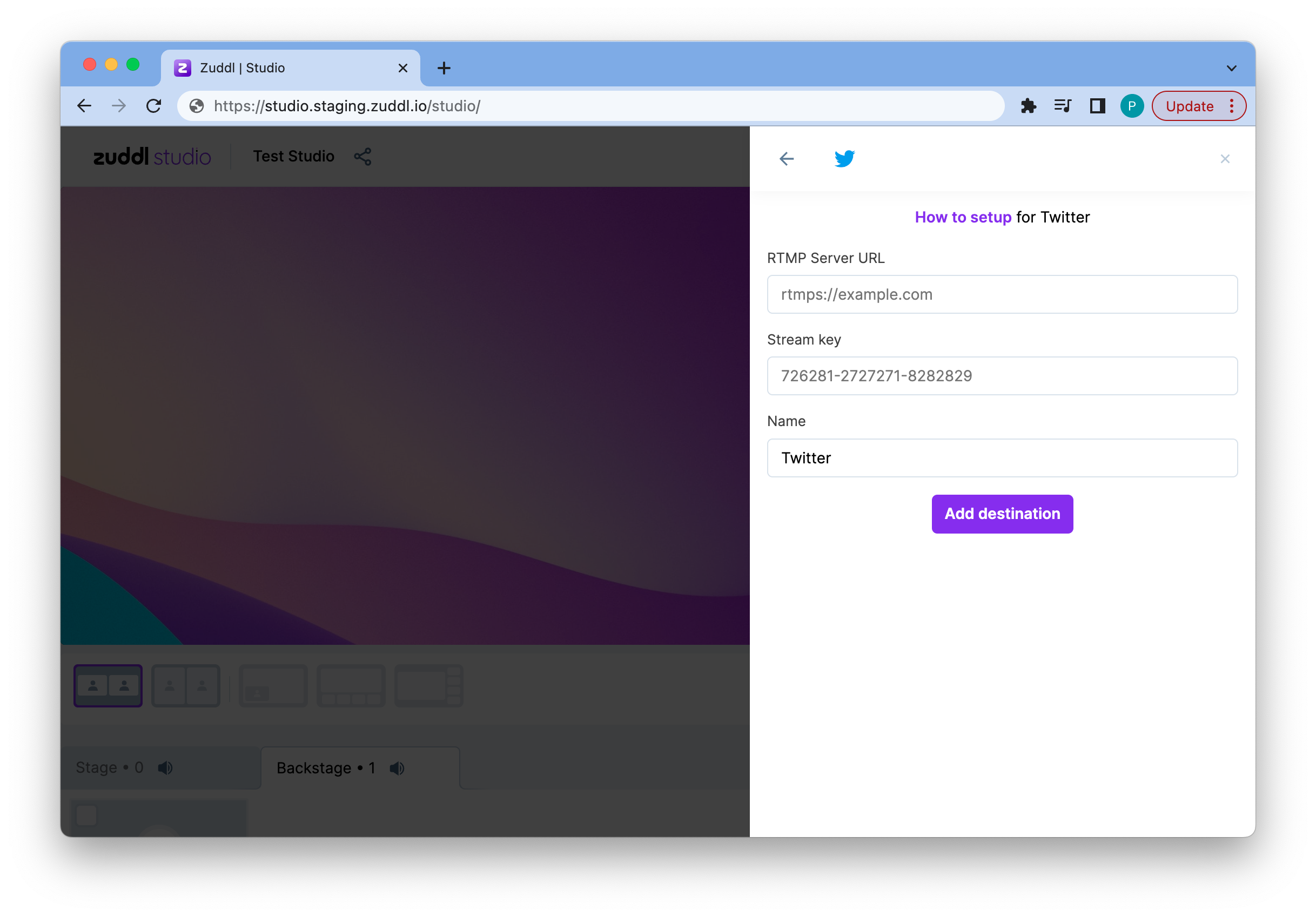 Click Add destination. This would add the Twitter destination in Zuddl Studio.