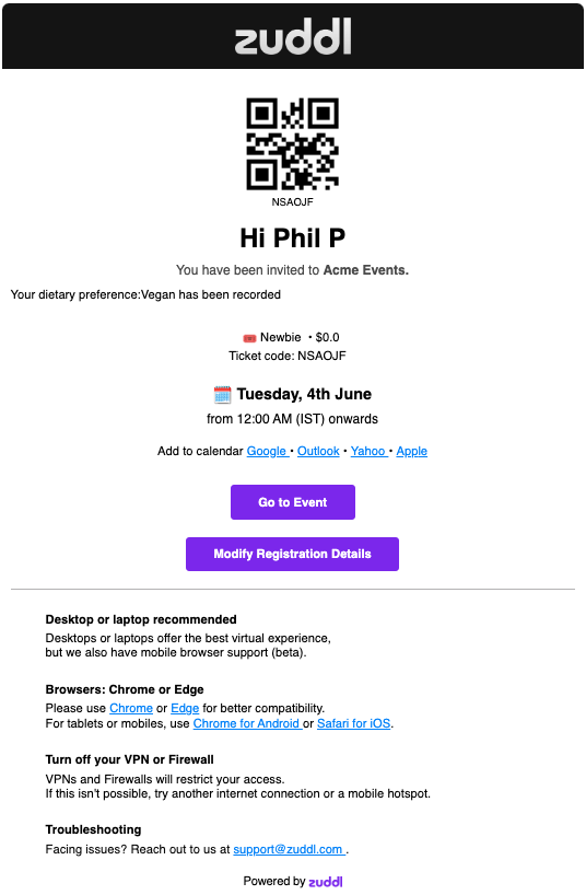 To use the custom fields that you've added in the registration form as merge tags, contact our support team at support@zuddl.com, they will provide the merge tag label which you can use while editing the emails. For example, to include a dietary preference custom field in your email, you can edit your email as shown below: