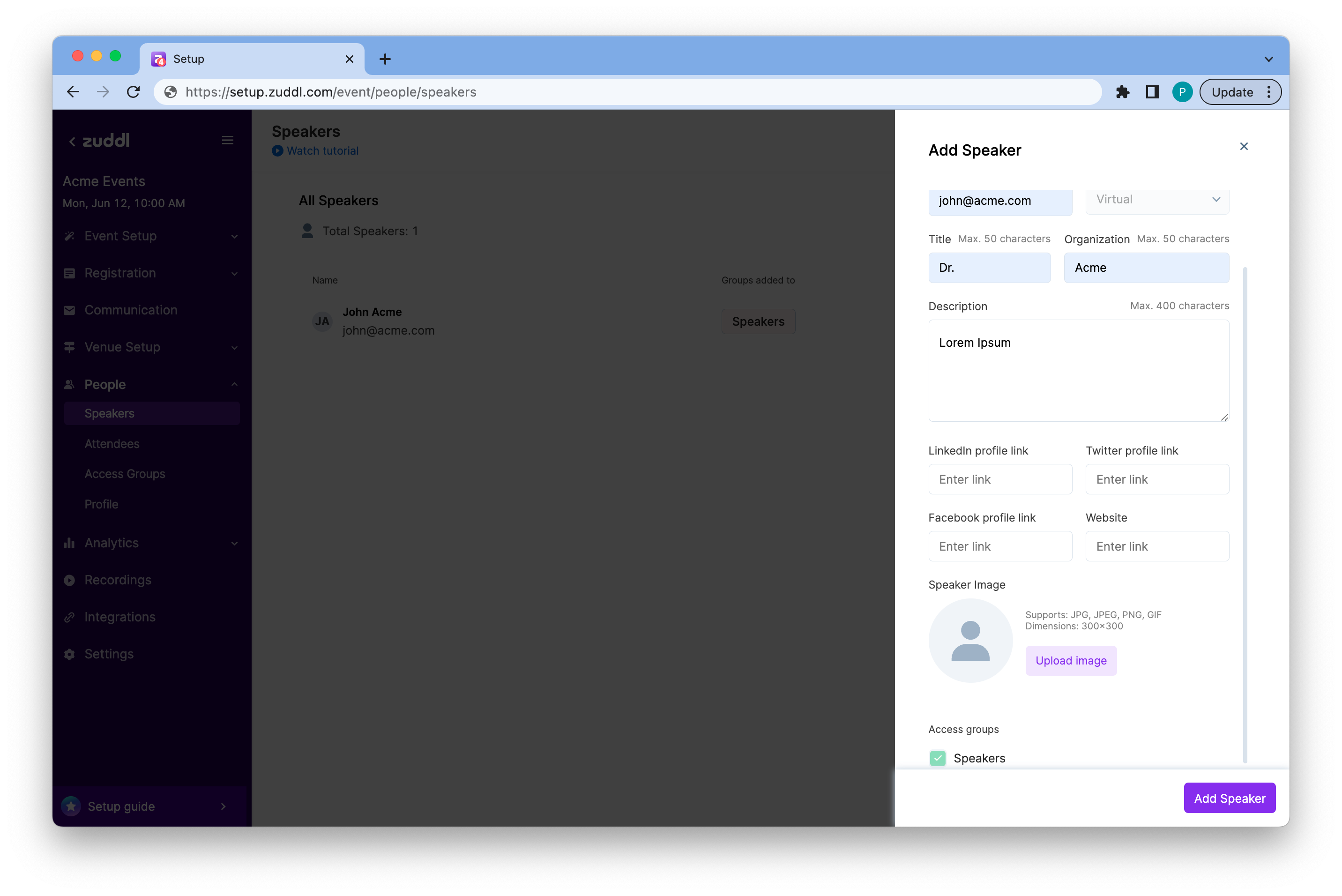- Optional. Click the Upload Image button to add the profile picture of the Speaker. The recommended format is a jpg, jpeg, png, or gif file with 300x300 resolution.